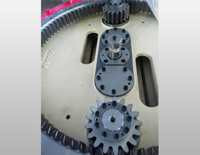 行星式混凝土搅拌机通过使用一体式双向搅拌减速机进行传动。减速机产生的动力使立式安装的搅拌臂既做自传运动又做公转运动,同时安装在搅拌筒的侧刮刀臂做公转运动。行星式混凝土搅拌机公转方向与自转方向相反,各搅拌星自转方向也不同。